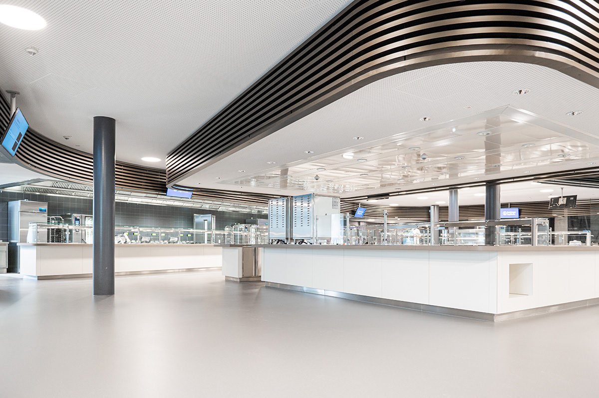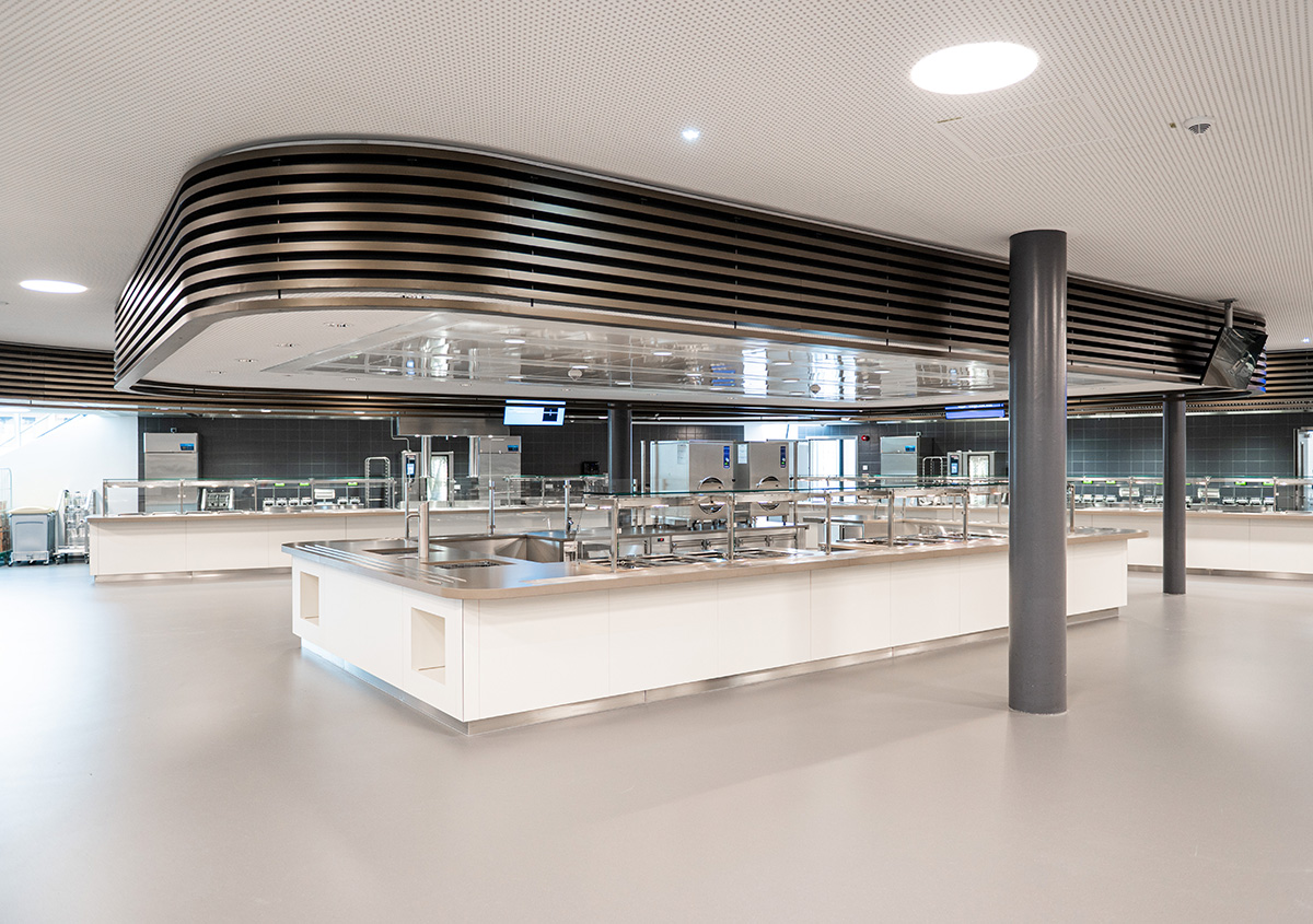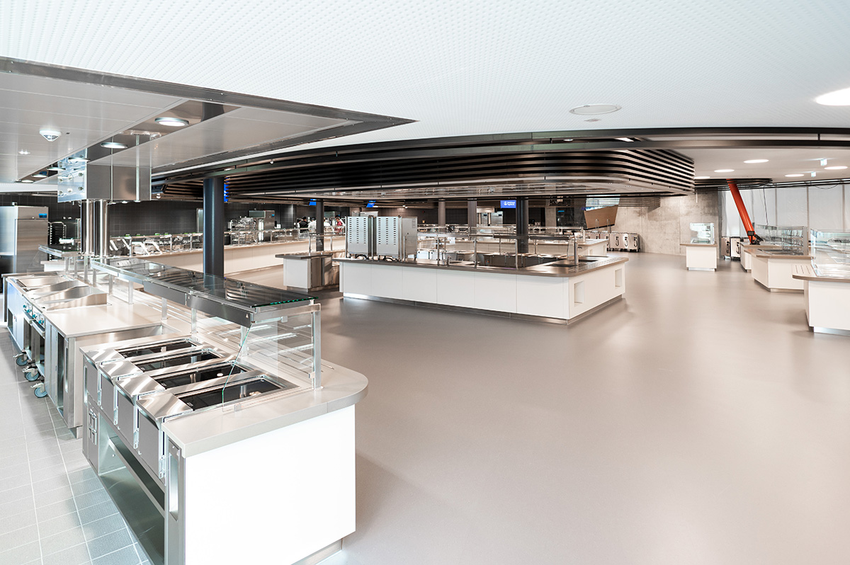Es umfasst sieben kleine Vorbereitungs- und Produktionsküchen. 12 Ausgabestellen und 3 Kassen sorgen für kurze Wartezeiten und einen raschen und reibungslosen Ablauf während der Rushhour am Mittag. Blickfang und ein weiterer Superlativ ist die, mit 18 m längste Ausgabetheke mitten im Betriebsrestaurant.