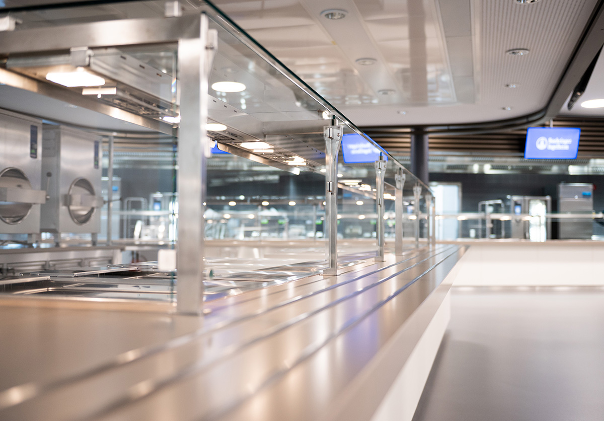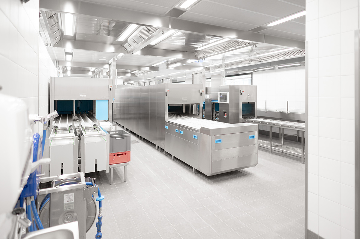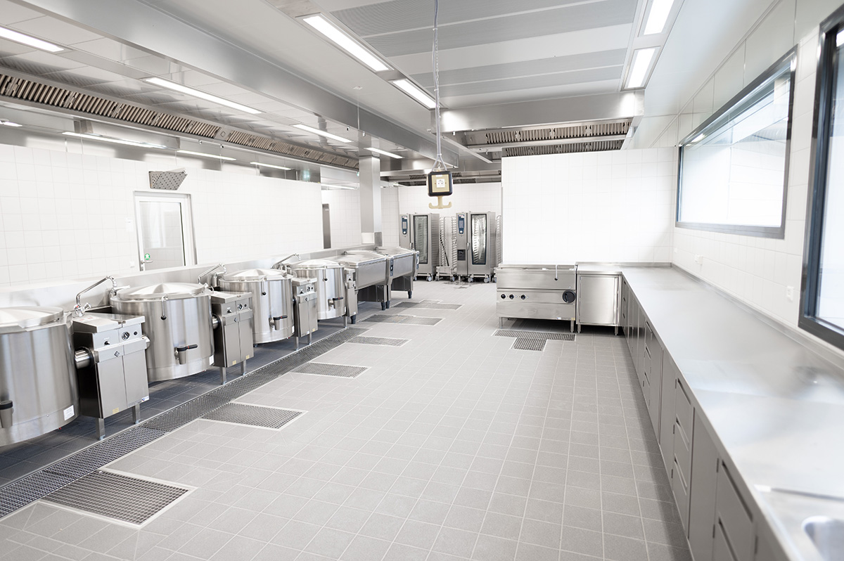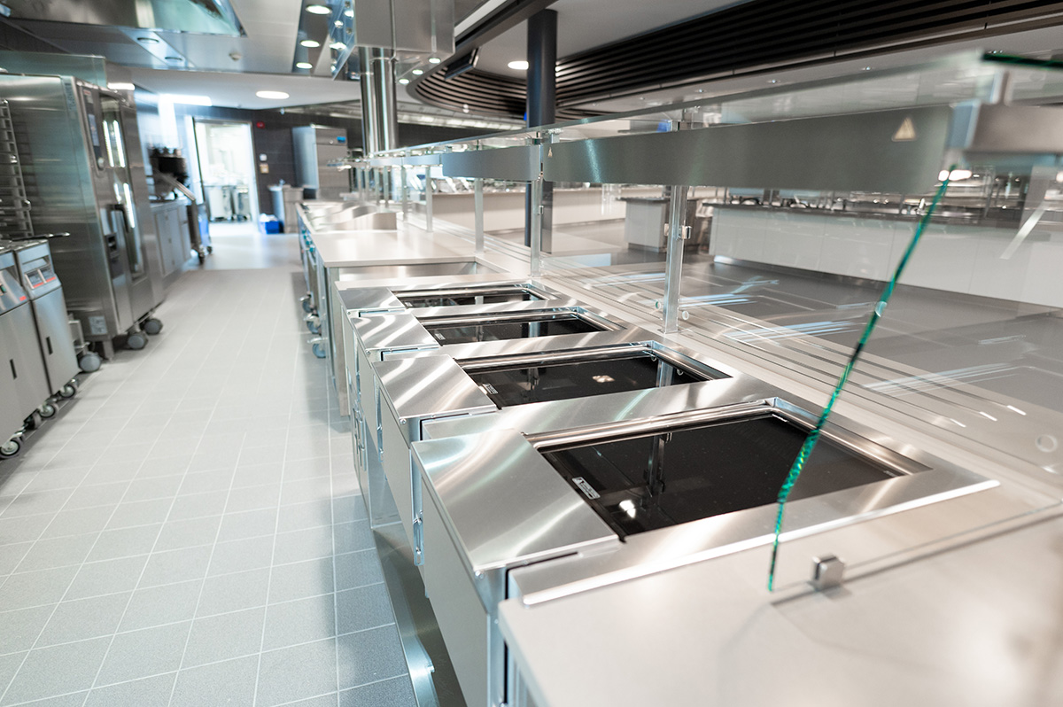 Es umfasst sieben kleine Vorbereitungs- und Produktionsküchen. 12 Ausgabestellen und 3 Kassen sorgen für kurze Wartezeiten und einen raschen und reibungslosen Ablauf während der Rushhour am Mittag. Blickfang und ein weiterer Superlativ ist die, mit 18 m längste Ausgabetheke mitten im Betriebsrestaurant.