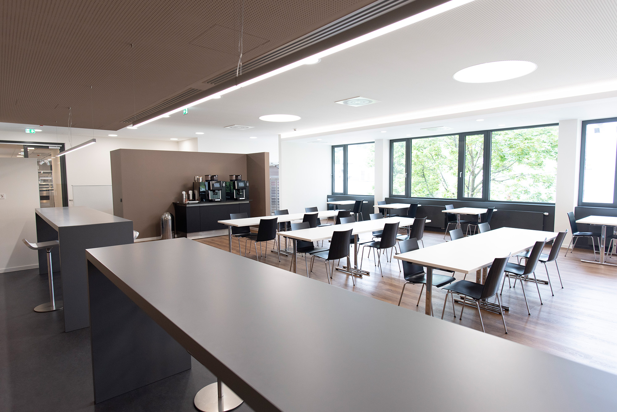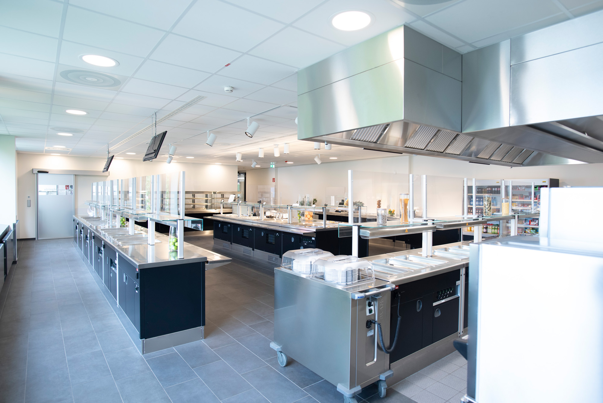 Für die Unternehmenszentrale in Dettingen an der Erms haben wir, gemeinsam mit dem Architekten, Küche, Ausgabe & Speisenraum neugestaltet und umgesetzt. Herausforderung war die Anlieferung der Geräte, die mittels Hebeanlagen in den bestehenden Bau eintransportiert wurden. Bestandsgeräte wurden in die Planung aufgenommen und werden weiter verwendet. Die räumlichen Gegebenheiten wurden optimal ausgenutzt, eine Korbtransportspülmaschine mit Eckförderung spart in der Küche Platz. In die Speisenausgabe wurde eine Frontcooking-Station mit Wok & Grillplatte eingebaut, der Speiseraum wurde mit Tischen, Stühlen und „gedeckter Tisch“ komplett ausgestattet.