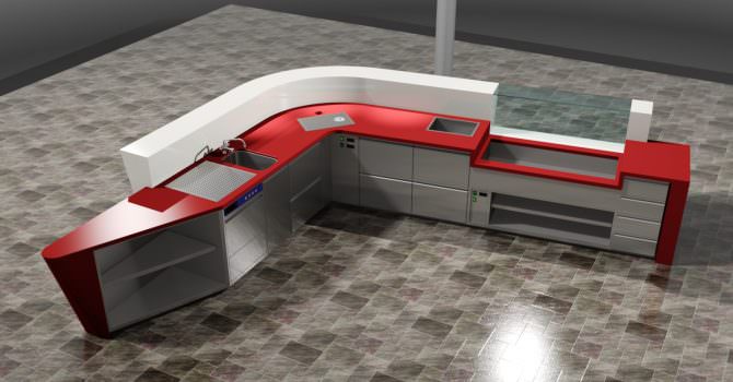 Von Familie Bohnenberger wurden wir mit der Planung und Umsetzung der Küche, Kältetechnik und Theke eines Gosch-Sylt Restaurant beauftragt. Die vom Kunden und Architekt gestellten Anforderungen, die Theke als Schiffsrumpf und die Fischtheke als Aquarium aussehen zu lassen, waren für uns eine absolute Besonderheit und wurden zur vollsten Zufriedenheit umgesetzt. Die Theke wurde 2-teilig angeliefert und vor Ort zusammengefügt und verschliffen. Als Wiedererkennungswert dienen das hinterleuchtete Logo in der Theke und die rote Steinabdeckung.