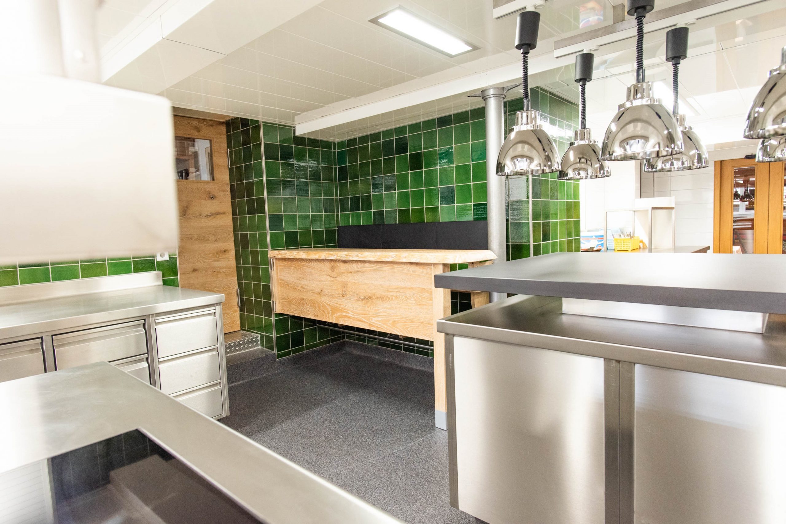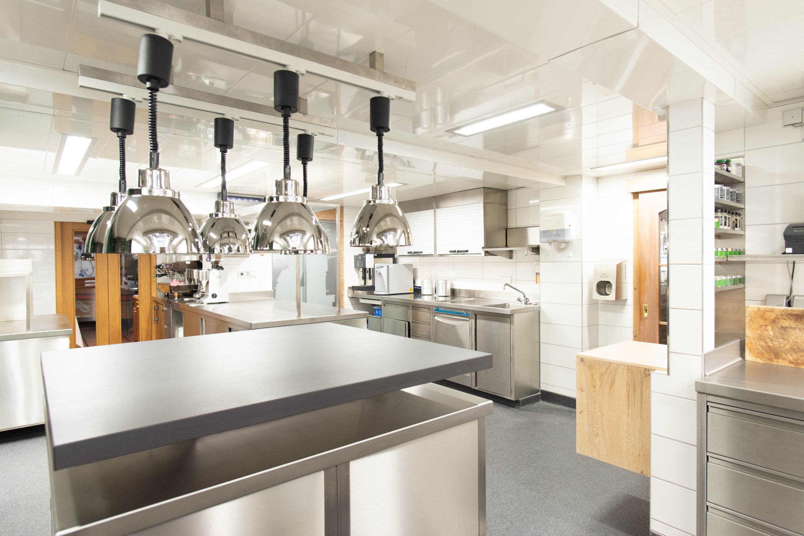 In intensiven Gesprächen mit der Gebrüder Holwarth GmbH vor Ort entstand die neue Küchenplanung, die aufgrund der unterschiedlichen Bausubstanz des ursprünglichen Gebäudes aus dem 16. Jahrhundert und dem „neuen“ Küchenanbau von 1980 für eine optimale Ablaufplanung eine Herausforderung darstellte. Die Besonderheiten sind vor allem zwei Passstationen auf den gegenüberliegenden Seiten des Herzstücks der Küche, dem zentralen Kochblock.