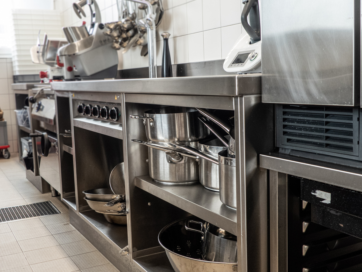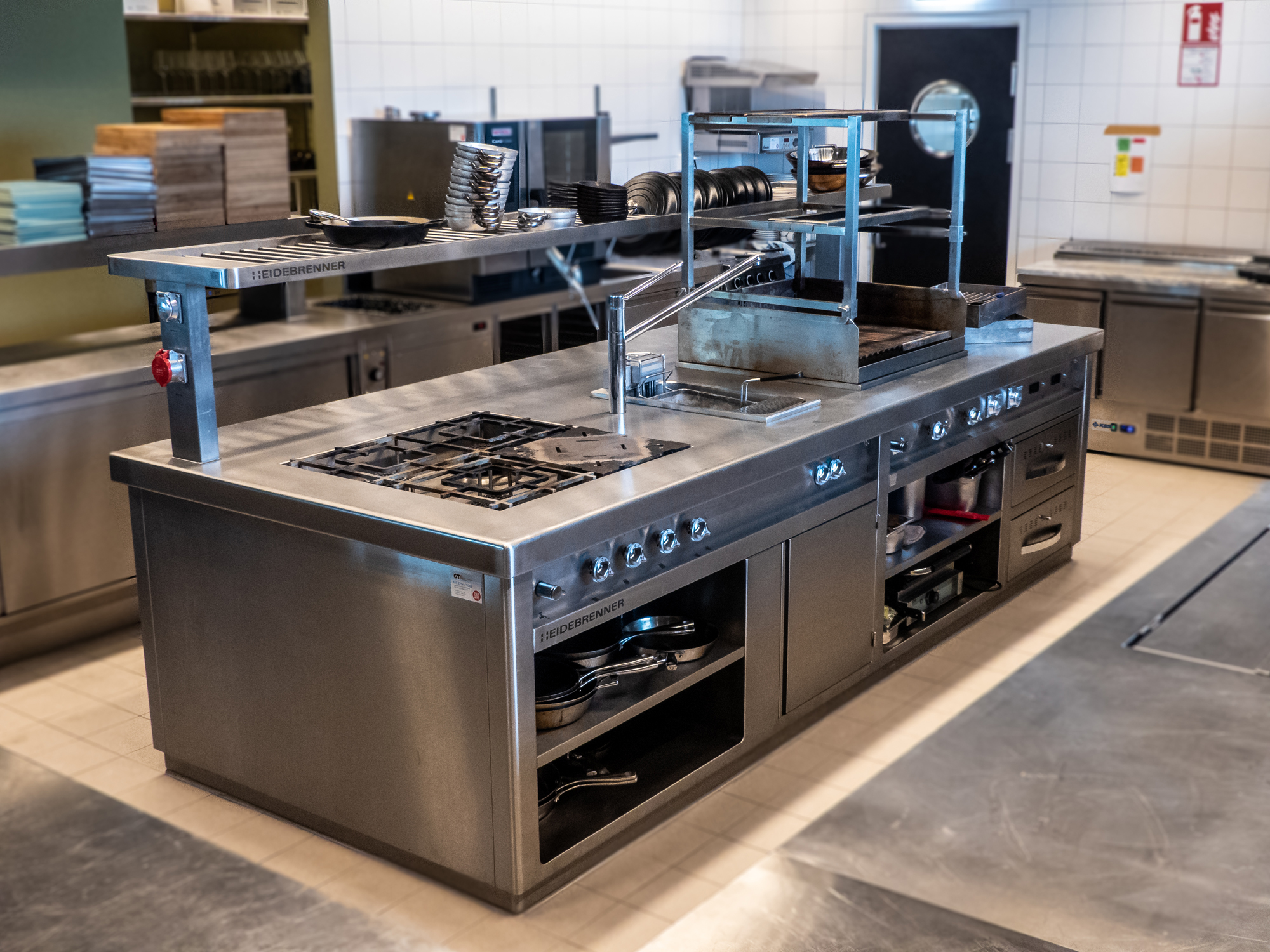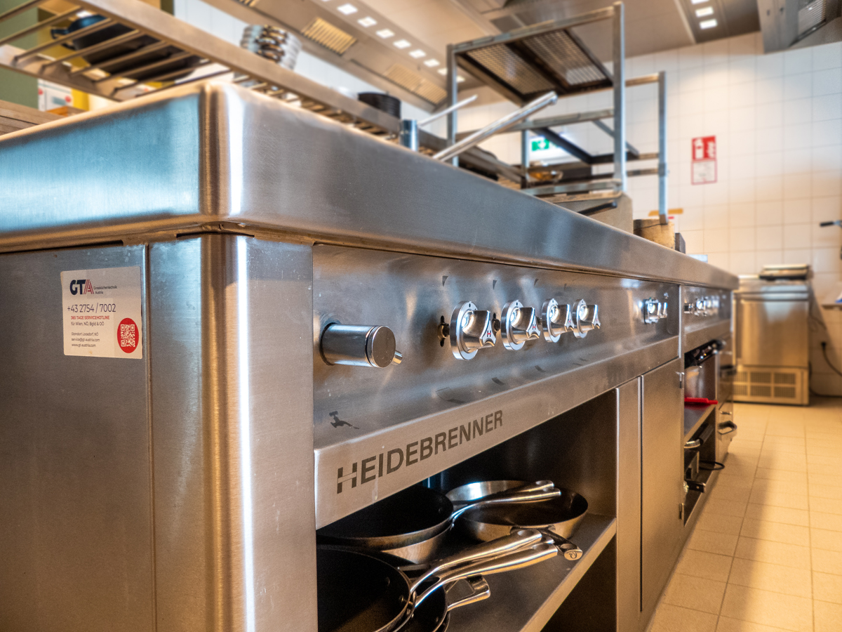 Die danebenliegende Produktions- und Showküche bietet dem Küchenpersonal alles was das Herz begehrt. Von Lagerung, Vorbereitung, Produktion bis zur Spülanlage wurde die Küche von uns komplett ausgestattet. Die Showküche ist mit der Produktionsküche direkt verbunden und zeigt dem Gast Einblick in verschiedenste Kochtechniken. Highlight dieser Küche ist, der aus einem Stück gefertigte, Kochblock der Firma Heidebrenner. Dank der modernen Gas-Kochmulden und eines mehretagigen Gas-Lavagrills können viele Variationen an Speisen vor den Augen der Hotelgästen gezaubert werden.