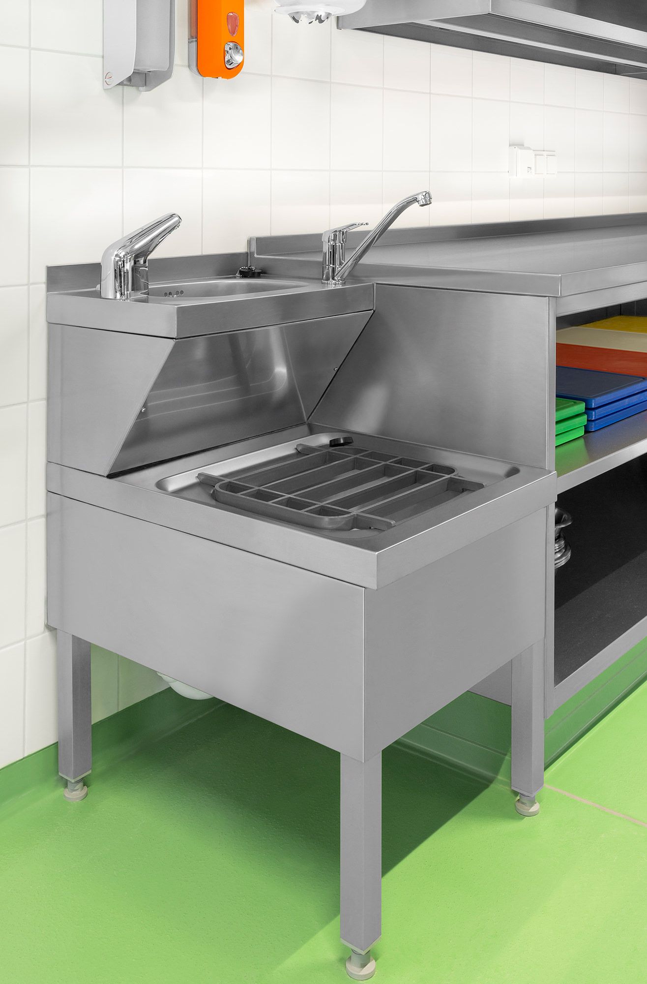 Die Küche wurde mit Geräten der Fa. Rational sowie von der Spültechnik von Colged und Einbaugeräten der Fa. Berner ausgestattet. Natürlich wurden die gesamten CNS Verbauten in unserer hauseigenen Produktionsstätte in Loosdorf gefertigt. Die ca. 100 m² große Küche ist mit viel Know How ausgestattet und macht den Angestellten viel Freude.