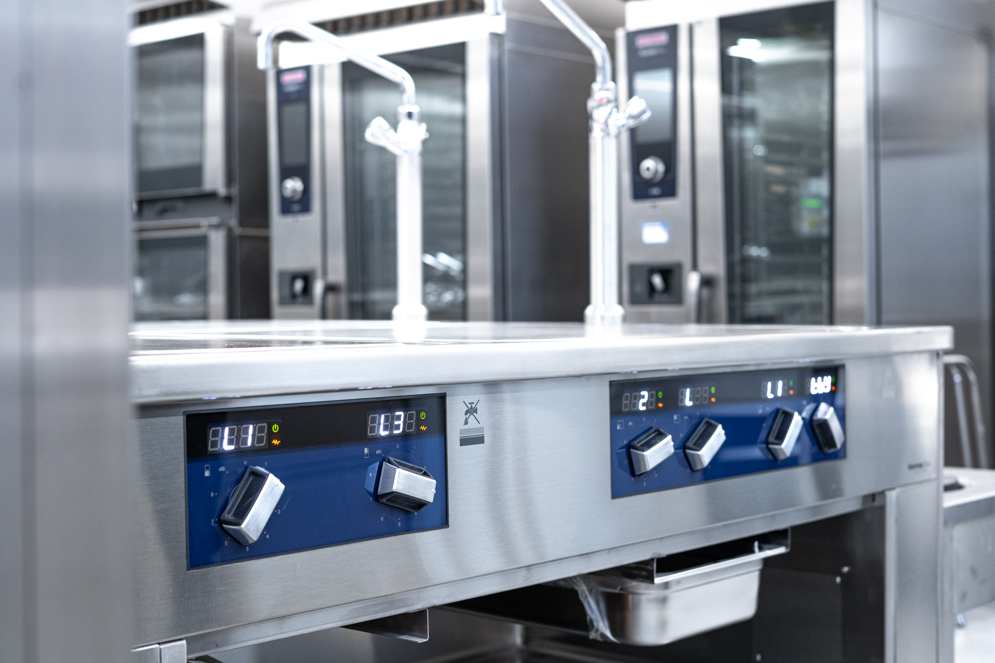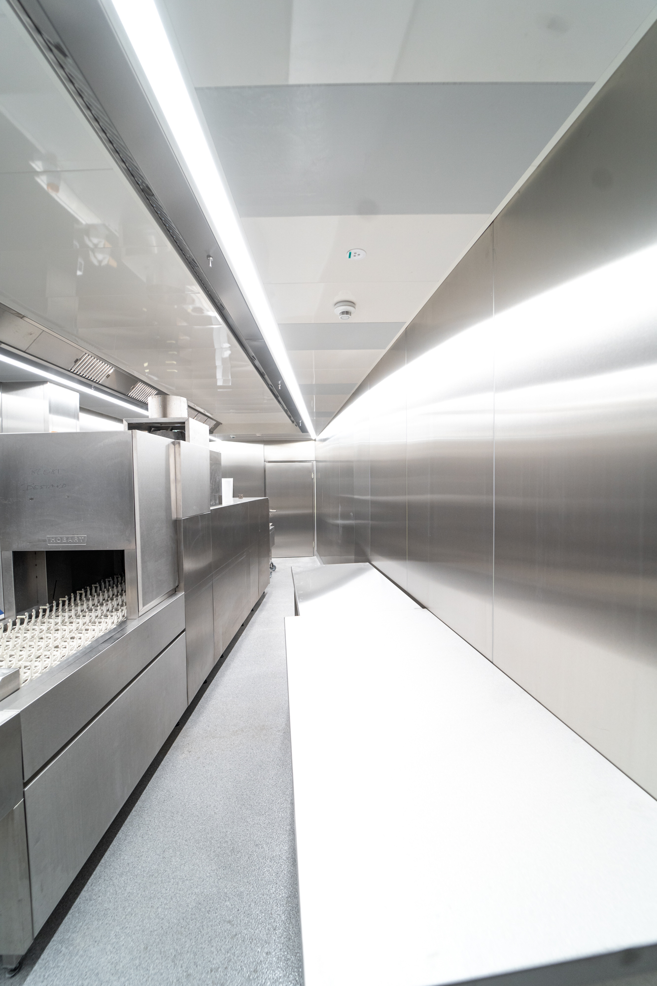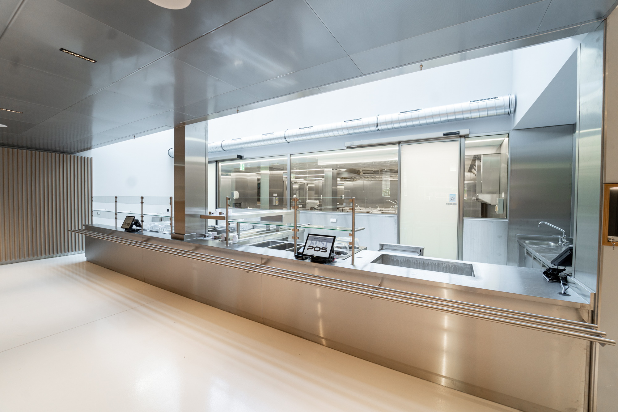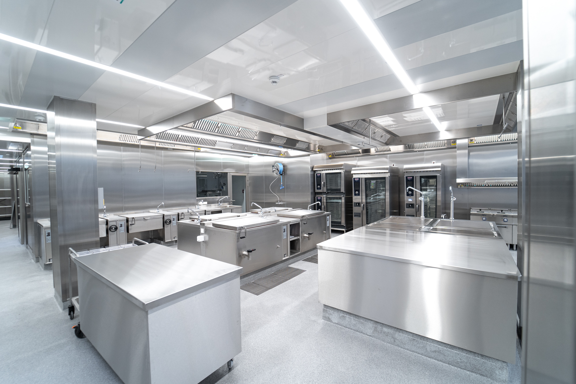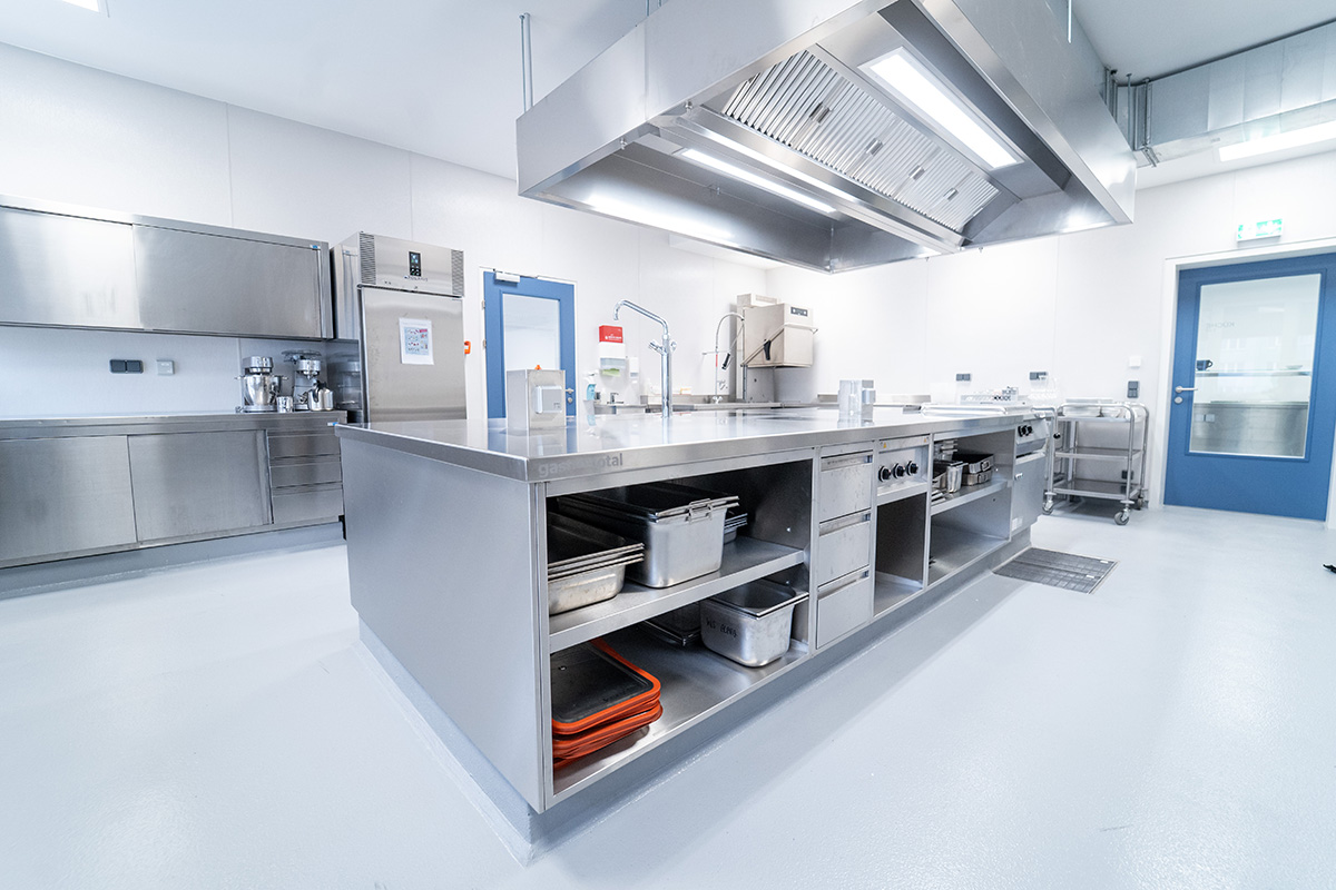 Von uns produzierte Edelstahlpaneele im gesamten Küchenbereich gewährleisten höchste Hygienesicherheit. Ein fünfspuriges Förderband präsentiert die Speisen der Selbstbedienungsanlage. Modernste Gartechnik kombiniert mit klassischen Kochgeräten bieten umfangreiche Produktionskapazitäten. Gemeinsam mit renommierten Marken der Großküchentechnik und unseren hauseigenen Möbeln der Marke STAHL wurde hier wieder eine moderne Großküche mit individuellen Ansprüchen umgesetzt.